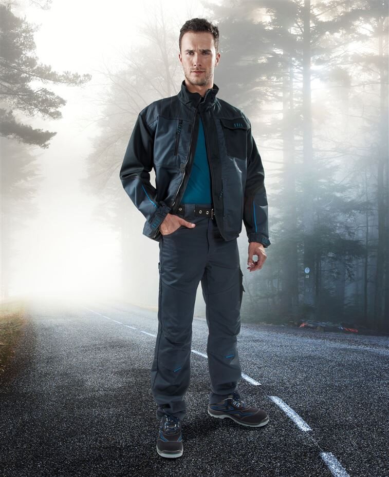 Ciekawie zaprojektowana bluzka robocza z kolekcji 4TECH o nowoczesnym wzornictwie w kolorze niebiesko-czarnym lub szaro-czarnym z subtelnymi turkusowymi dodatkami wykonana jest z wygodnej mieszanki poliestru i bawełny.