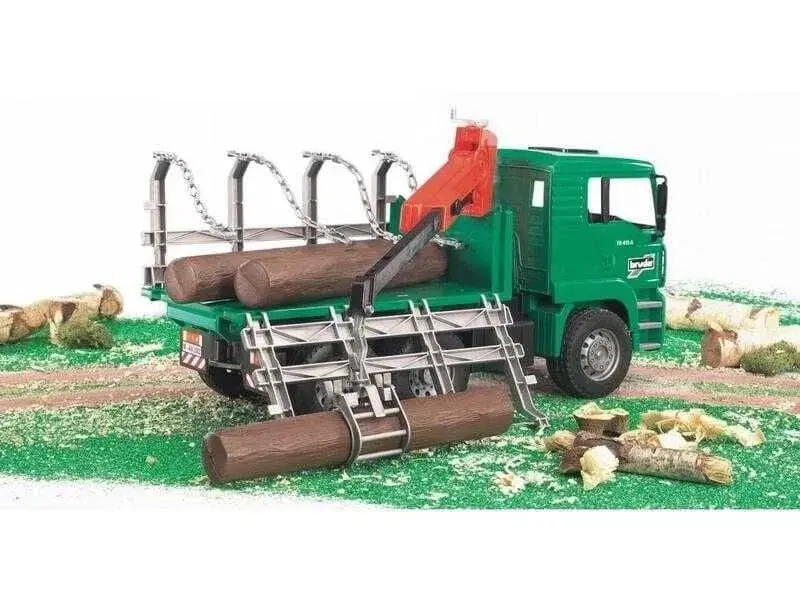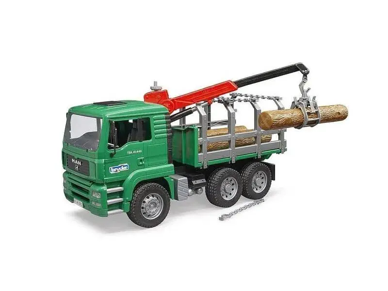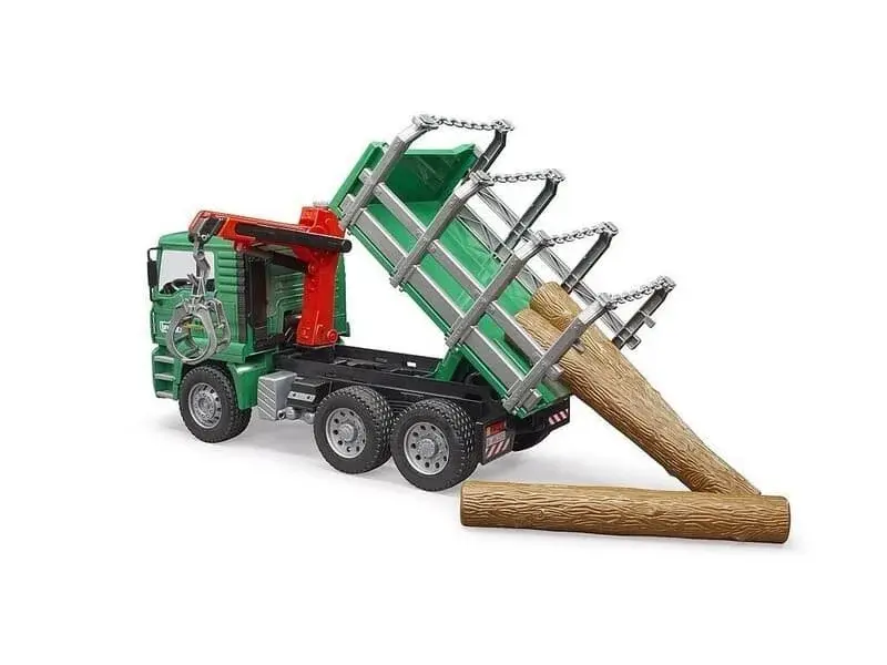 BRUDER 2769 – samochód ciężarowy MAN – transporter drewna. Samochód ciężarowy MAN do transportu drewna z wysięgnikiem, możliwość załadunku, składania, składania wysięgnika, wywrotu skrzyni. Zawiera trzy kłody drewna.