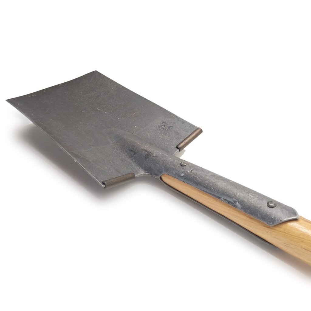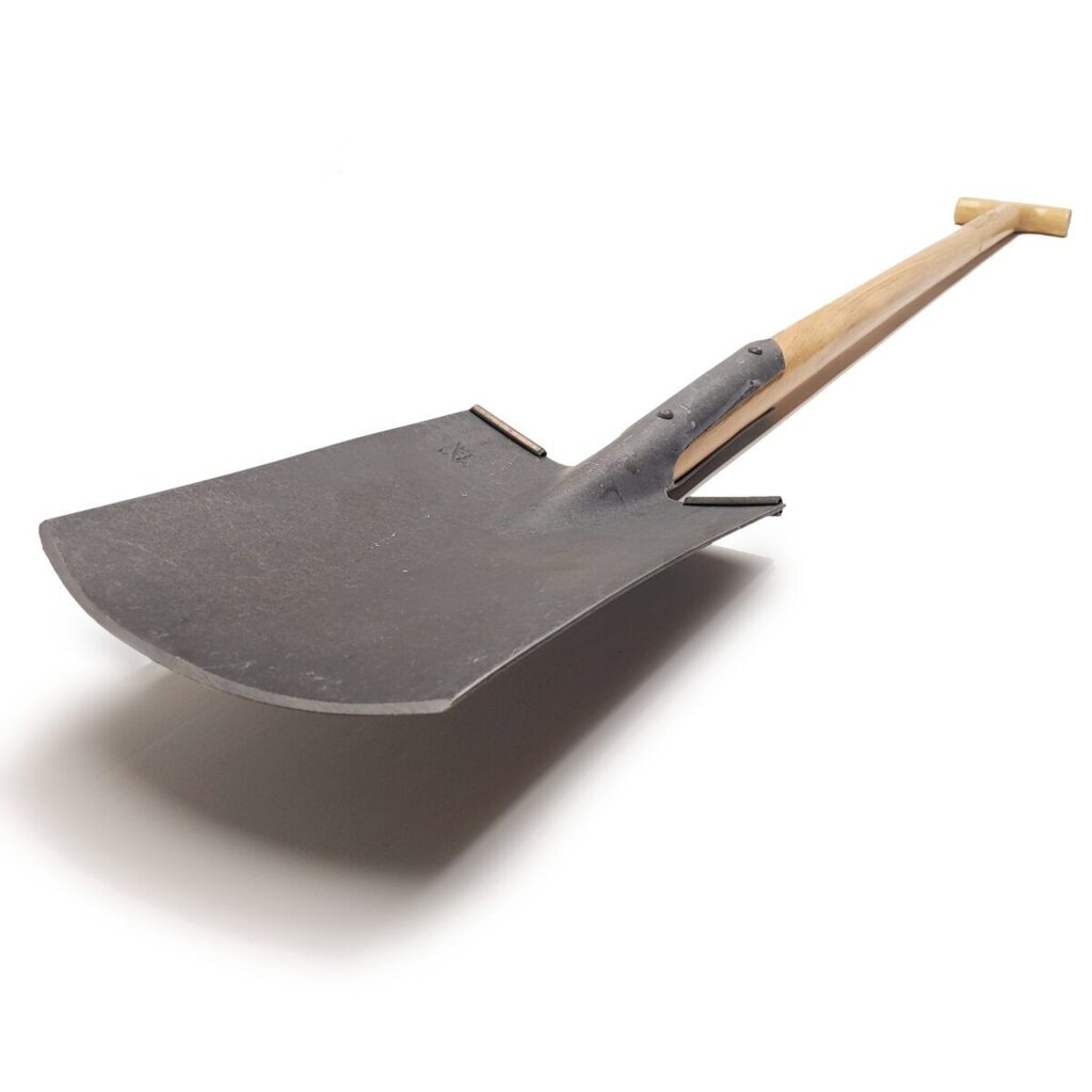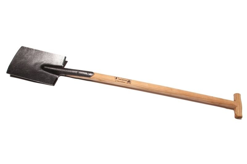 Ręcznie kuta łopata KRUMPHOLZ z bieżnikiem i trzonkiem jesionowym, o długości 92 cm z trzonkiem w kształcie litery „T”. Długość części roboczej łopaty wynosi 29 cm, szerokość 18 cm, całkowita długość łopaty wynosi 125 cm, a waga całkowita 2200 g.