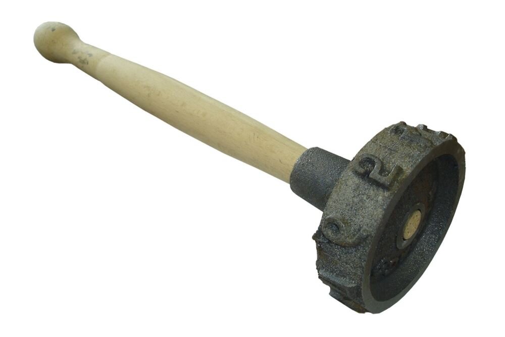 Maszyna numerująca z pojedynczym pierścieniem, z cyframi od 0 do 9. Wysokość cyfry 25 mm. Długość drewnianego uchwytu 40 cm.
