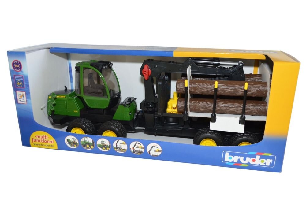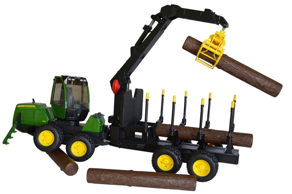 Plastikowy model forwardera John Deere 1210E z czterema kłodami. Forwarder posiada otwieraną pokrywę silnika i drzwi, kabinę obracającą się o 360° oraz składane stopnie. Funkcjonalne, obrotowe ramię hydrauliczne z osiami chwytającymi i wahliwymi.