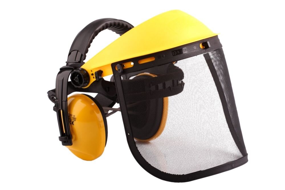 Osłona ochronna ze słuchawkami i siatką metalową do pracy z podkaszarką.