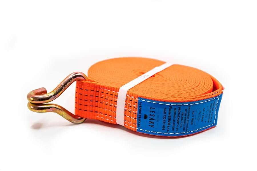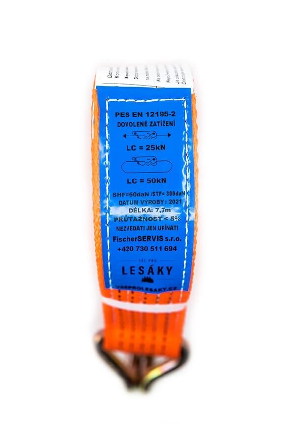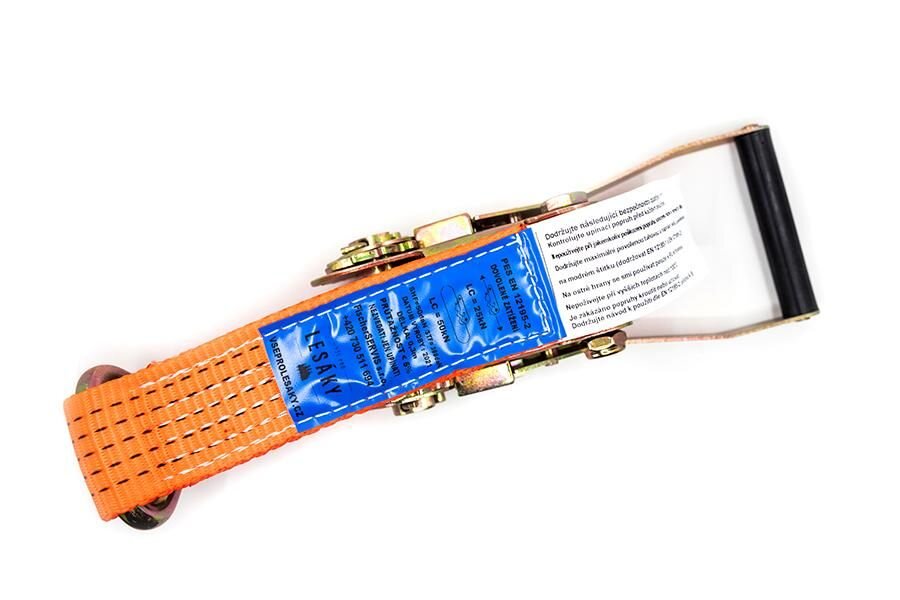 Szerokość pasa 50 mm. Wytrzymałość na rozciąganie 2500 kg, po owinięciu ładunku 5000 kg. Dwuczęściowy pas mocujący jest produkowany zgodnie z normą EN 12195-2. Służy do zabezpieczania ładunków. Wykonany z poliestru.