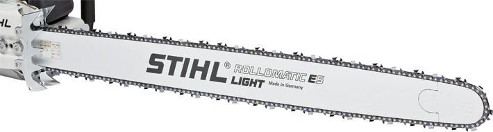 Wykonana ze specjalnej stali odpornej na zużycie. Wolne przestrzenie są frezowane i spawane specjalnym procesem laserowym. Stabilna, pusta głowica z górną i dolną konstrukcją, odporna na zginanie. 30% oszczędności masy w porównaniu z Rollomatic ES. Piła Stihl Ematic z ukośnym otworem olejowym, końcówka prowadnicy może być całkowicie wymieniona. Bezobsługowa dzięki uszczelnionemu łożysku w kole prowadzącym.