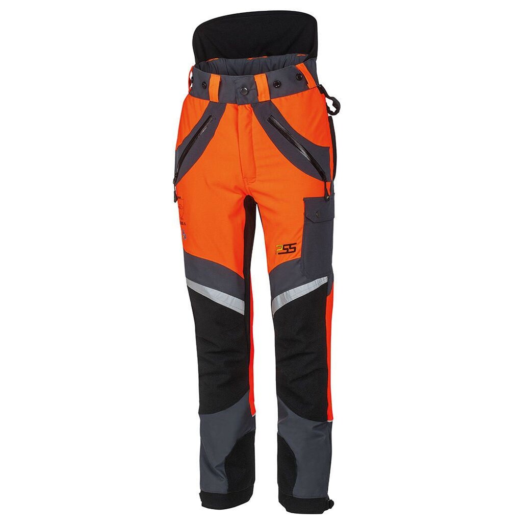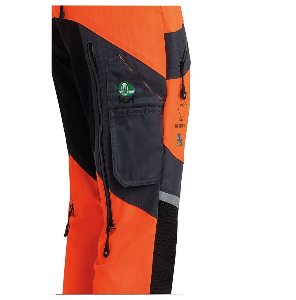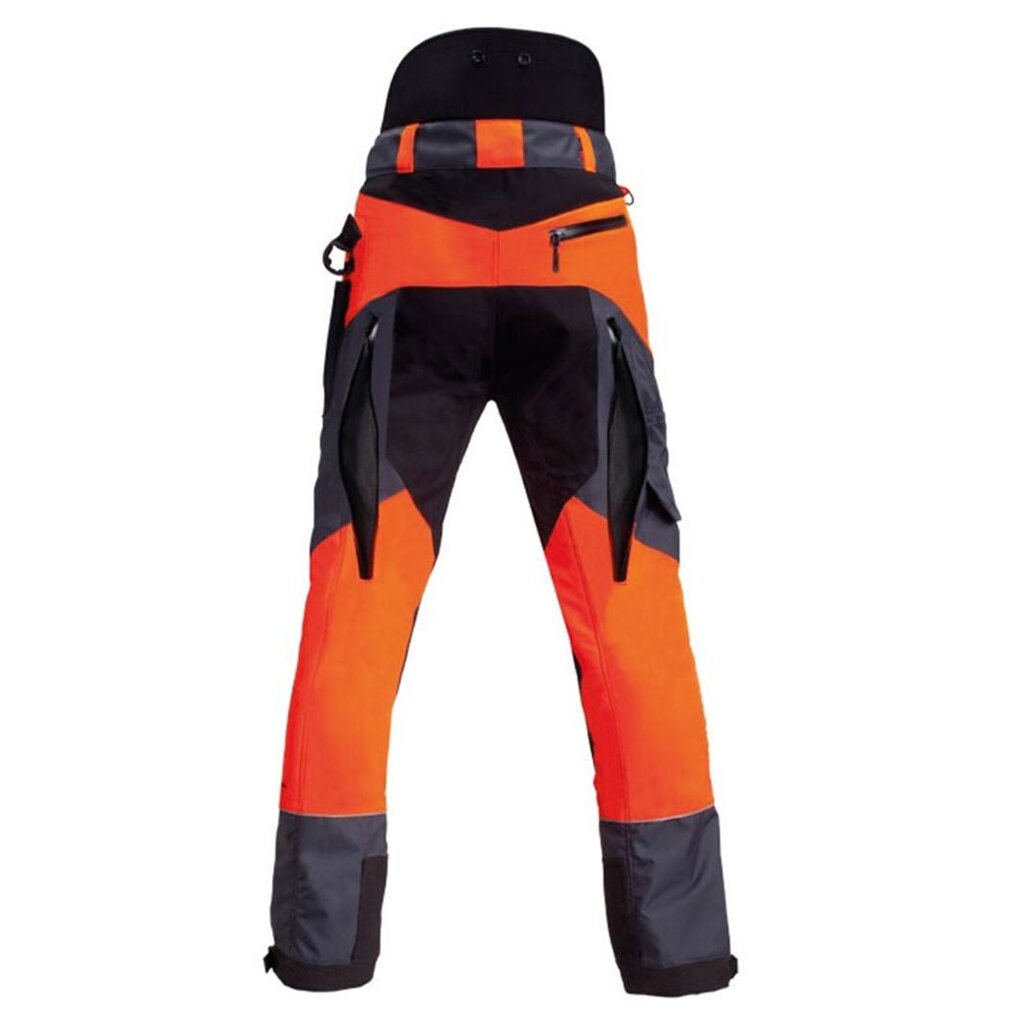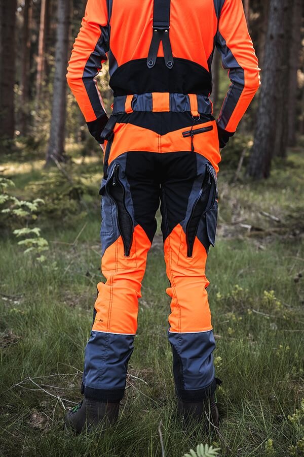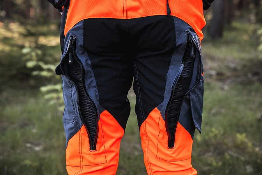 Przód nogawek jest pokryty wodoodporną tkaniną zewnętrzną sięgającą do kolan. Zapewnia to lepszą ochronę przed wilgocią z tyłu. Oznacza to, że tkanina zewnętrzna nie wchłania wilgoci. U dołu nogawek znajduje się ściągacz z haczykami, za pomocą którego spodnie można pewnie przymocować do butów leśnych. Zapobiega to zsuwaniu się spodni podczas pracy w śniegu lub zaczepianiu. Z tyłu spodni znajdują się długie zamki wentylacyjne, które naszym zdaniem są najskuteczniejszymi otworami wentylacyjnymi.