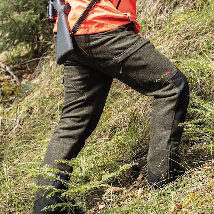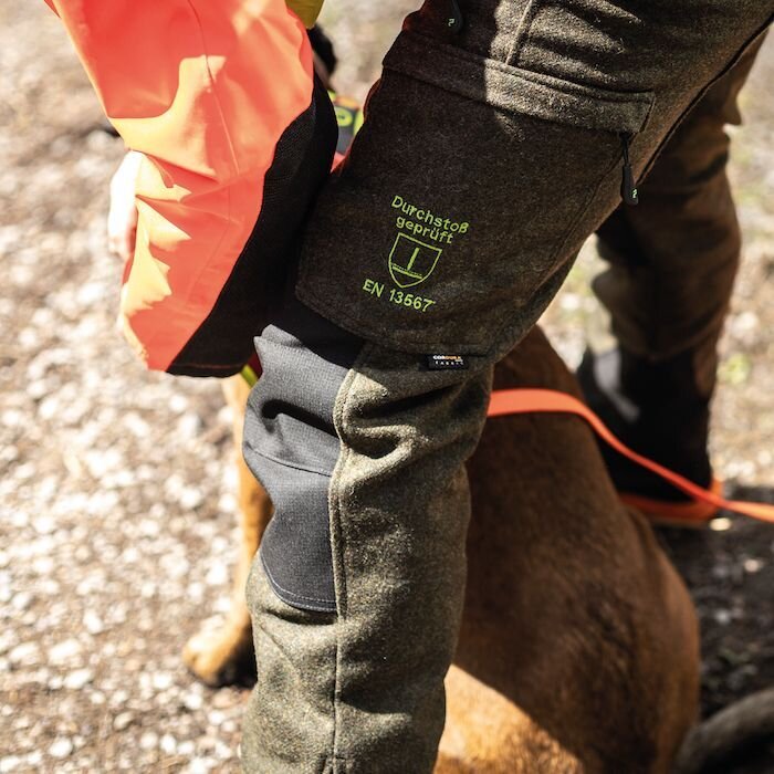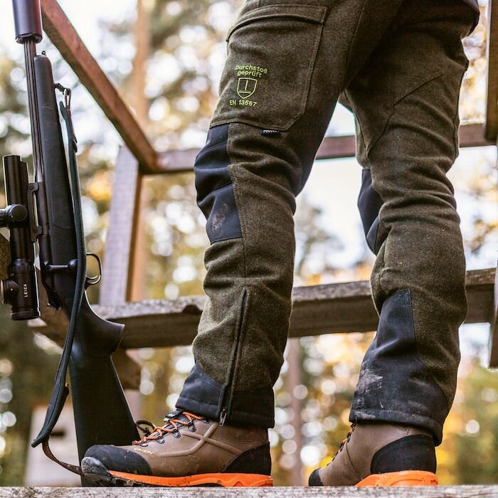 Ideą naszych spodni myśliwskich PSS X-treme Protect Loden, nie jest ich używanie do polowań pędzonych, ale do poszukiwania postrzelonych dzików. Bo kto nie zna sytuacji, gdy strzela się do dzika, a strzelec najpierw zagląda w krzaki lub pole kukurydzy? Aby zapewnić bezpieczeństwo w tej niebezpiecznej sytuacji, opracowaliśmy ochronę przed przebiciem z przodu nogawki w kroku i w łydce.