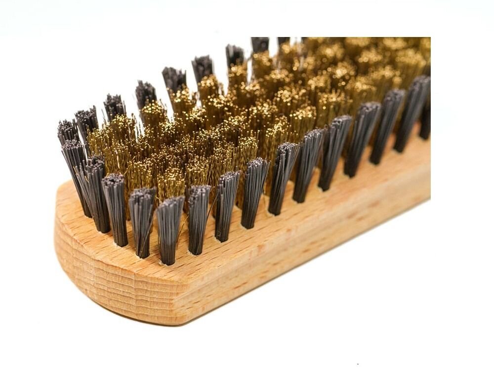 Szczotka wykonana z materiałów naturalnych: drewna i miedzi. Nadaje się wyłącznie do butów zamszowych (z włosiem).