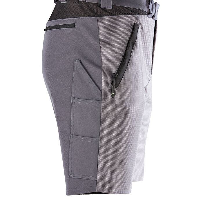 Spodenki wyposażone są łącznie w pięć kieszeni: dwie kieszenie na zamek, kieszeń tylną, kieszeń na metr oraz kieszeń na lewym udzie z przegródką na smartfon.