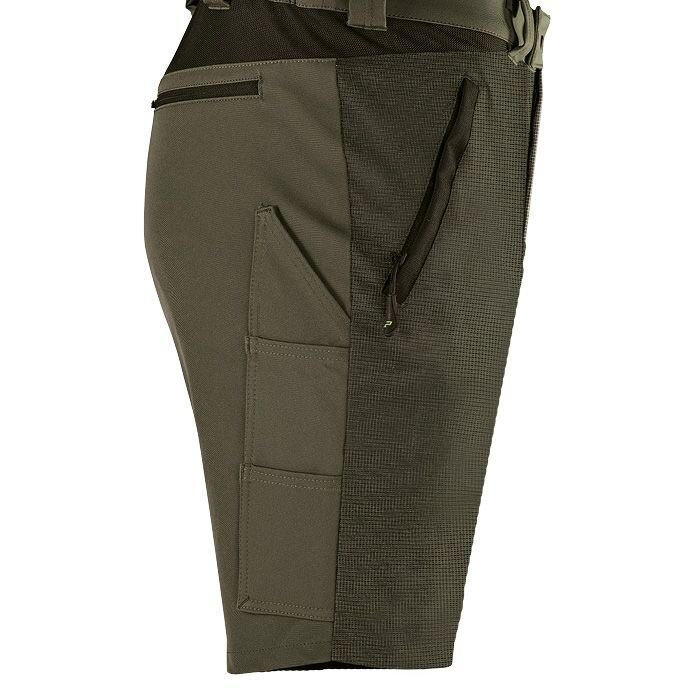 Spodenki wyposażone są łącznie w pięć kieszeni: dwie kieszenie na zamek, kieszeń tylną, kieszeń na metr oraz kieszeń na lewym udzie z przegródką na smartfon.