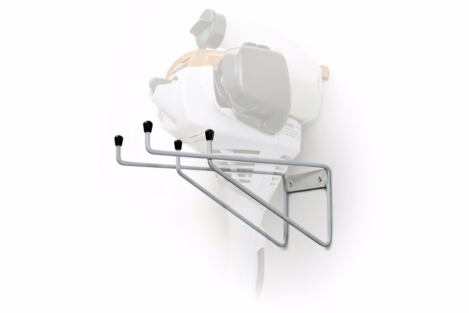 Univerzální kovový držák, který je navržený tak, aby umožňoval snadné a praktické zavěšení křovinořezů i dalšího zahradního či pracovní vybavení přímo na zeď, čímž zvyšuje přehlednost a šetří místo.