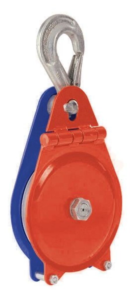 Krążek stalowy, ocynkowany, z łożyskami kulkowymi, osłony boczne pokryte tworzywem sztucznym. Łatwe wkładanie liny dzięki mechanizmowi składania.